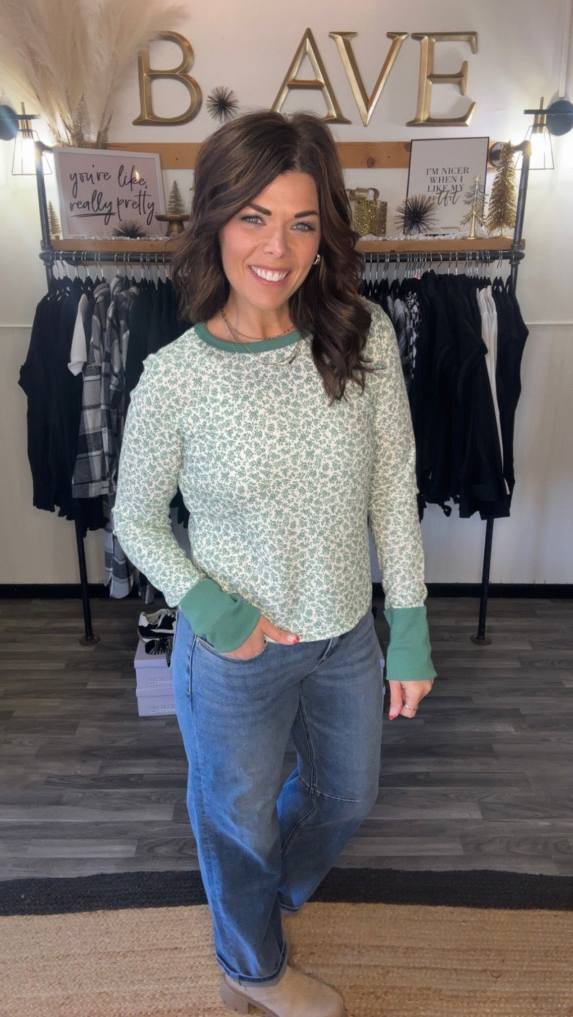 Green & Ivory Textured Floral Waffle Long Sleeve Top