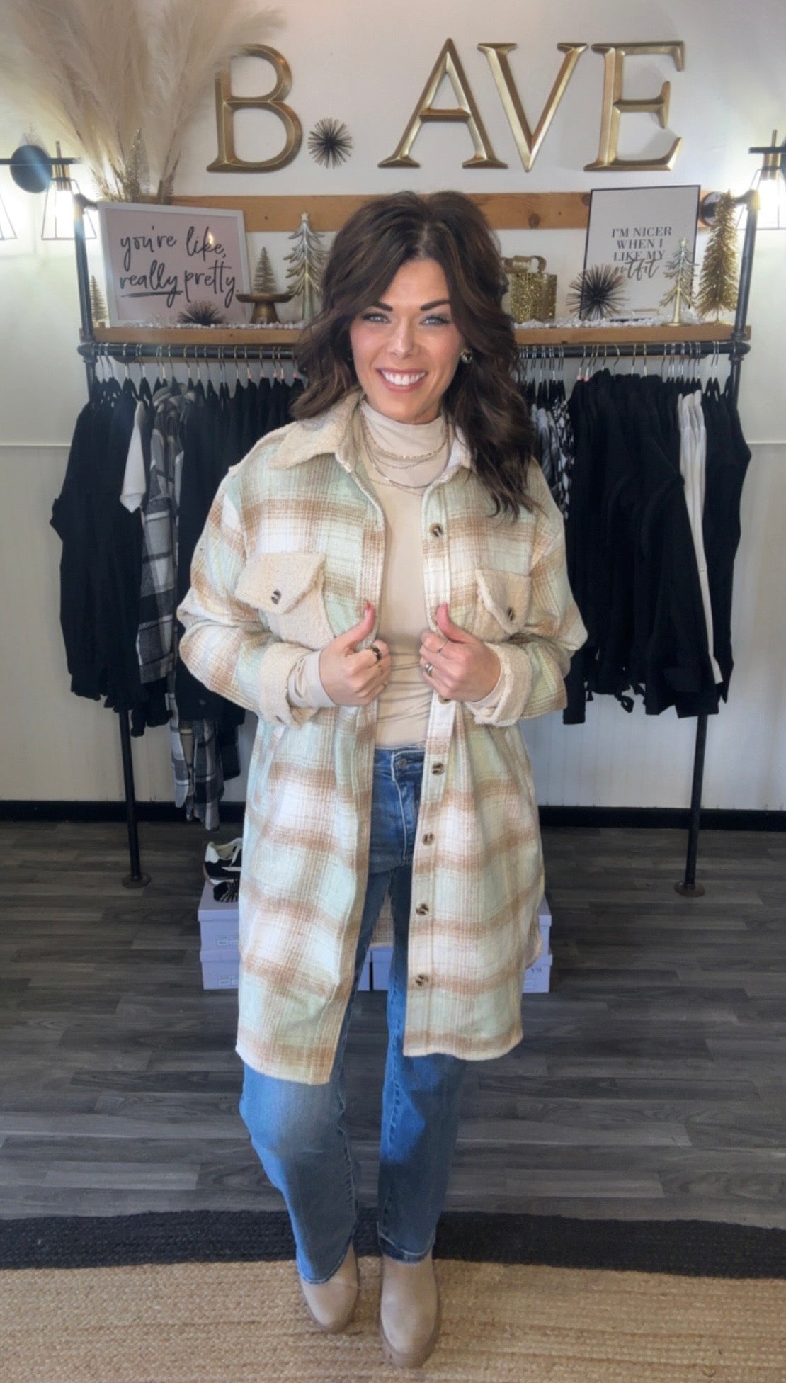 Cream & Mint Plaid Long Soft Flannel Shacket