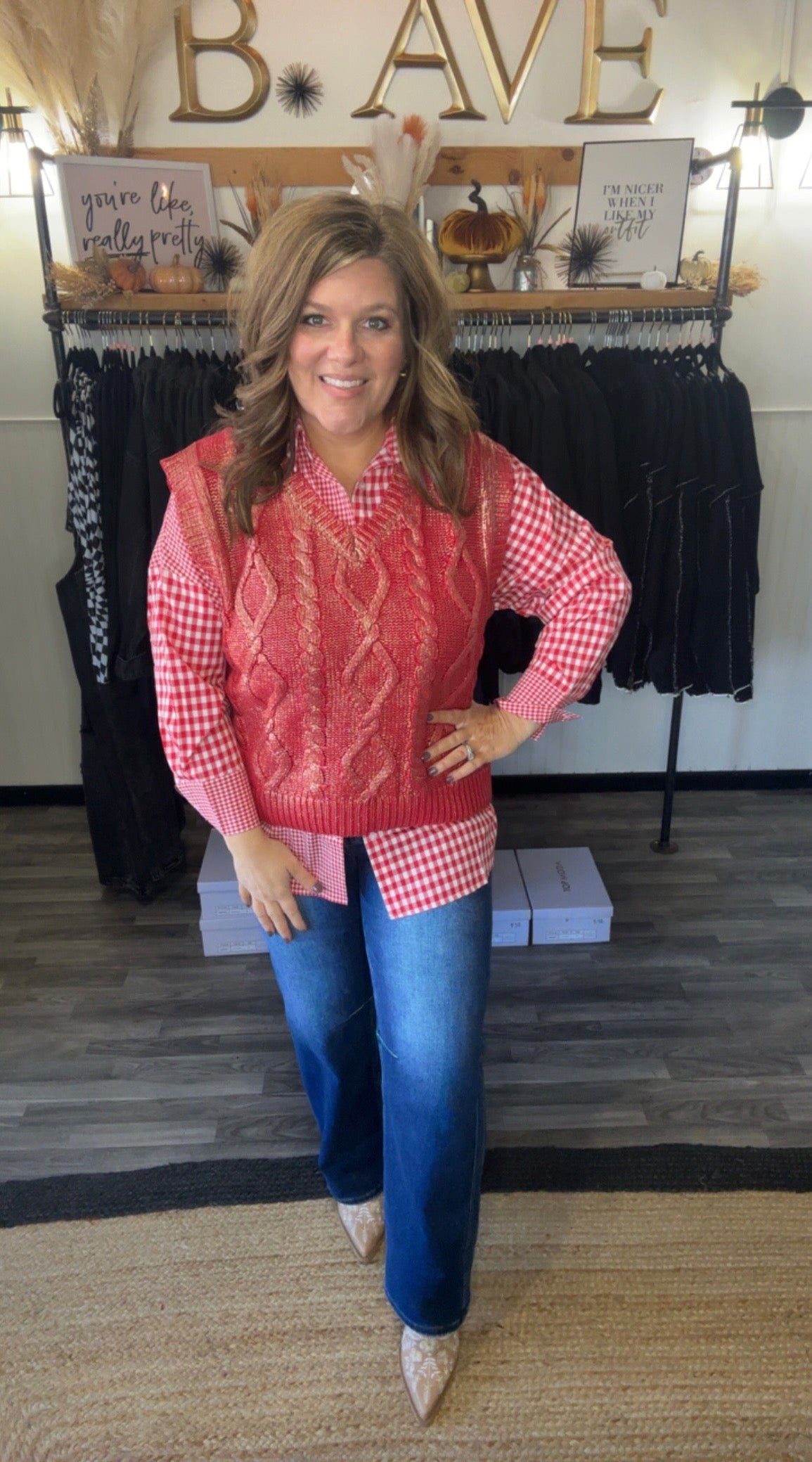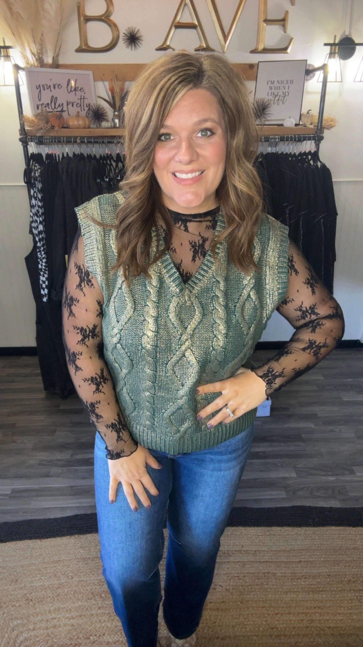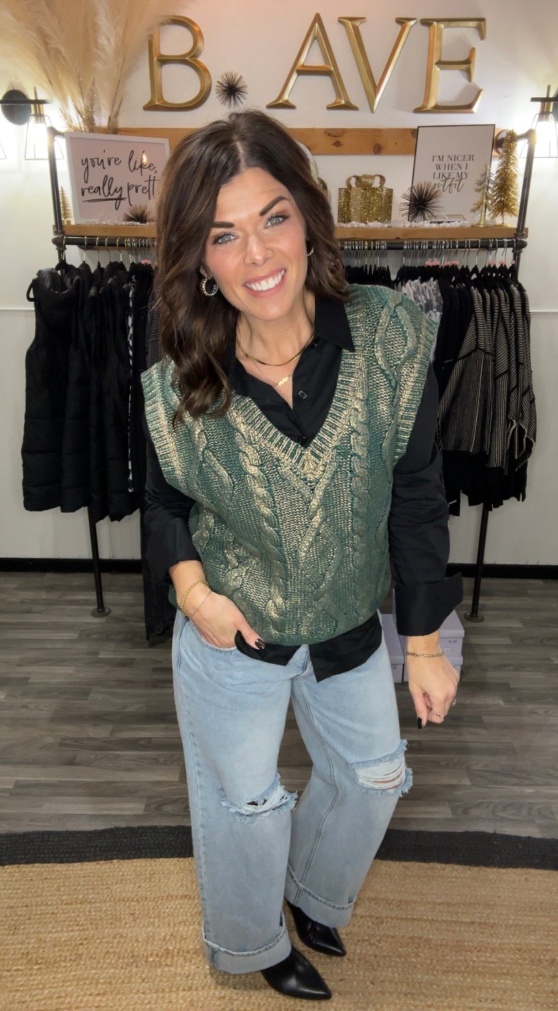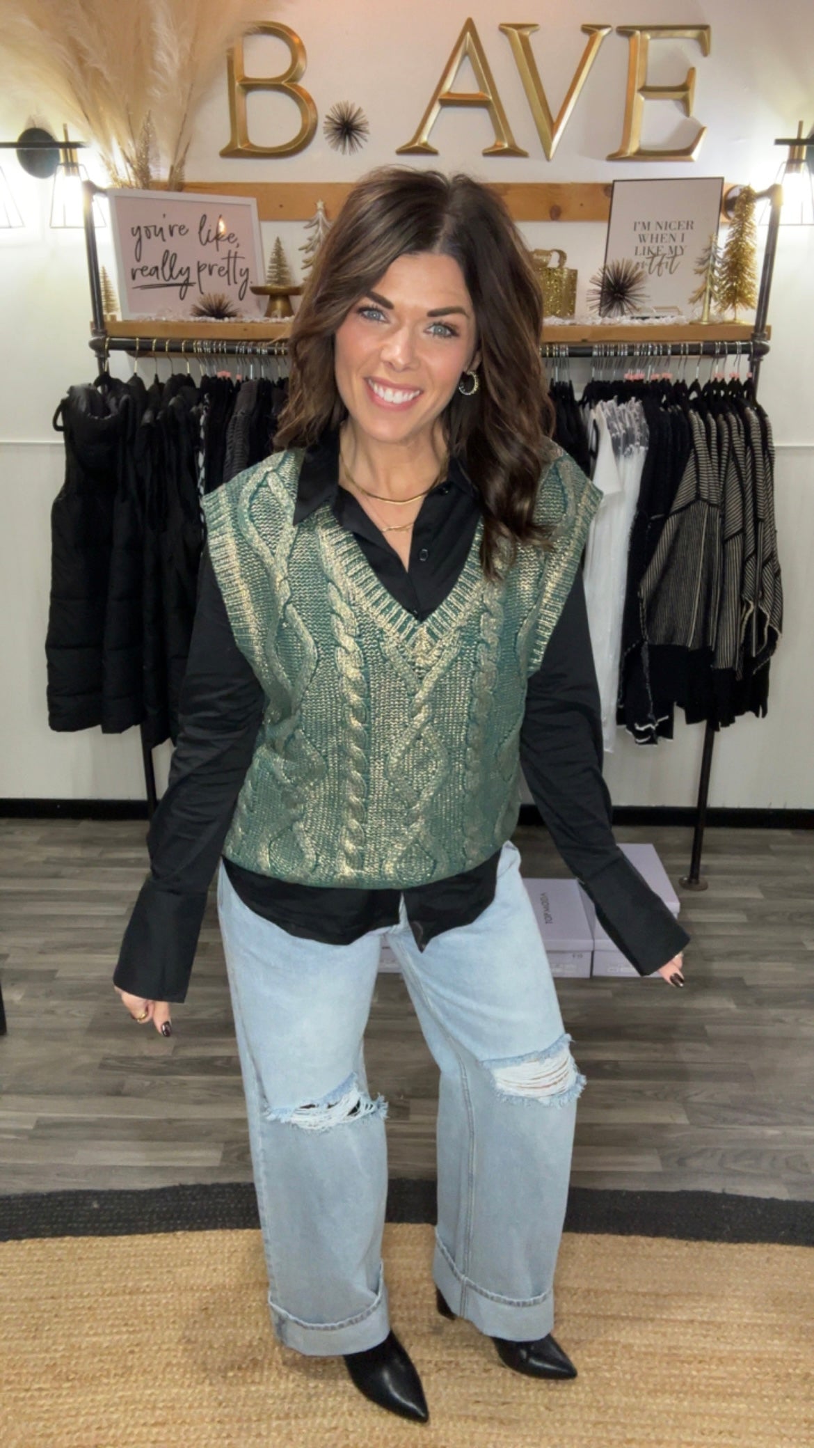 Make a bold fashion move with this eye-catching cable knit sweater vest, elevated by a shimmering metallic gold foil coating that catches the light from every angle. The textured cable knit construction adds depth and dimension, while the lustrous gold finish transforms a classic silhouette into an instant statement piece. Perfect for layering over your favorite basics, this fun and fabulous vest brings sparkle and personality to any outfit. Dress it up or down—either way, you'll turn heads.